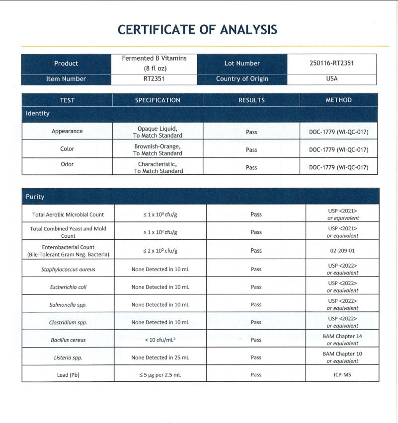 Fermented B-Complex 8oz is based on cutting-edge scientific research and expert formulation to support liver health, immune health, adrenal health, mood balance, balanced stress levels, and increased energy. Fermented B-Complex 8oz utilizes bioavailable B-vitamins to provide comprehensive health support. It stands out with its revolutionary probiotic-fermented B vitamins, making it a groundbreaking formula in the nutrition industry. What sets Fermented B-Complex 8oz apart is its innovative ND Technology™ (Novel Micro-cultured Delivery), which enhances oral absorption and bioenergetic properties. Users have reported remarkable effects from the first dose, confirming its exceptional quality and effectiveness. Our formula is proudly made in the USA in an FDA registered facility, following Good Manufacturing Practices (GMP) standards. Our commitment to excellence is reflected in the fact that only 4% of the supplements on the market can match our world-class standards. |