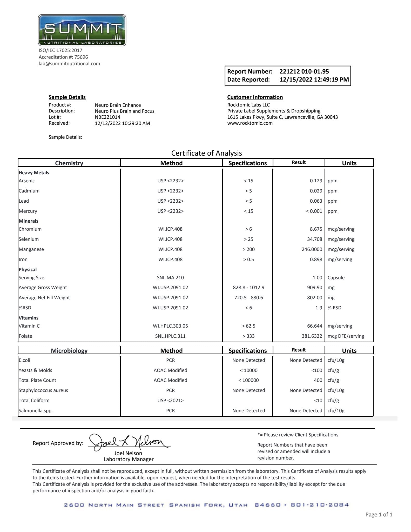 | Neuro Plus is formulated to boost cognitive function, mental clarity, focus, immune function, and energy production. Our product is synthesized utilizing the latest scientific research and formulated with high-quality ingredients. Our formula is third-party independently tested for heavy metals, impurities, made in the USA, GMP certified, and produced in an FDA registered facility. 1% of the supplements on the market can match our world-class standards. |